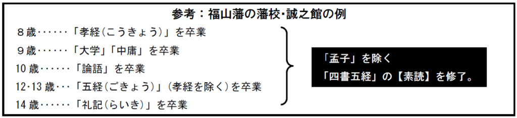 ◆参考に、福山藩の藩校・誠之館の例を下記に記載しました。驚くことに、「孟子」を除く「四書五経」の【素読】を14歳までに修了していることです。